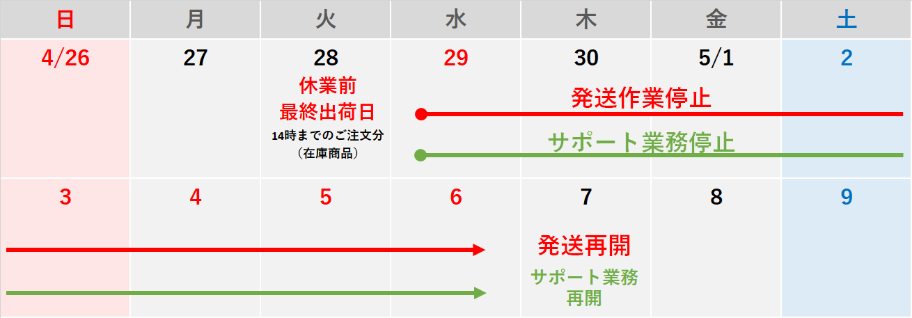 ■ゴールデンウィーク休業期間:2026年4月29日(水)~5月6日(水)