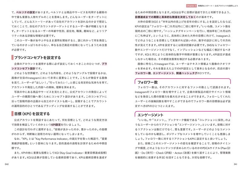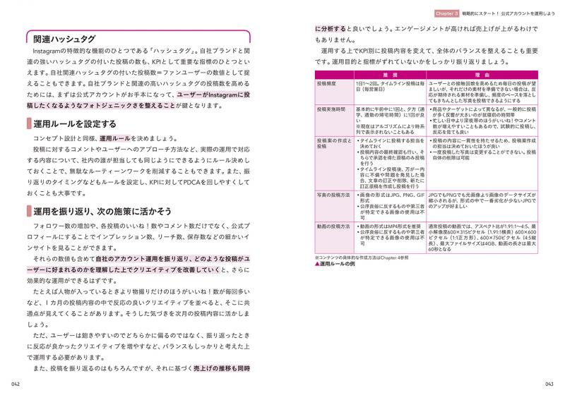 アカウント登録の流れ、お洒落な写真の撮影・加工方法、ハッシュタグの付け方などが紹介されている本。アパレルブランド、ヘアサロン、ネイルサロン、コスメブランドといった企業の公式アカウントを運用したい人におすすめの本ですが、「どんなユーザーをターゲットにするか」「どんなコンセプトにするか」「どんな目標を設定するか(フォロワー、いいね、コメントの数など)」「どんなルールで運用するか」といった事柄の決め方も載っているので、個人の方の参考にもなると思います。