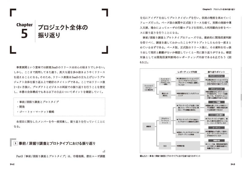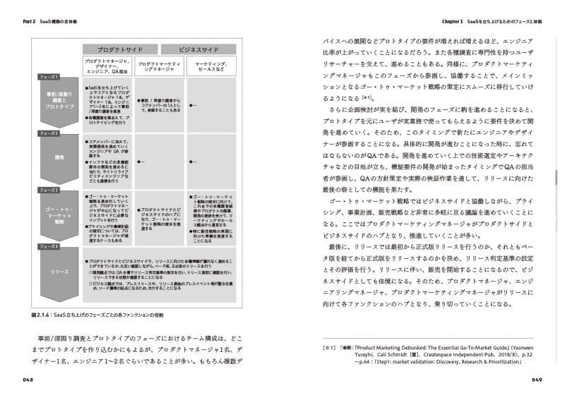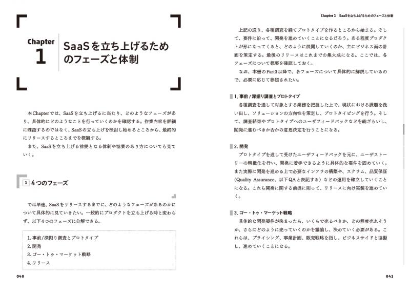 本書ではSaaSの立ち上げを、大きく4つのフェーズ(事前/深掘り調査とプロトタイプ、開発、ゴー・トゥ・マーケット戦略、リリース)に分けて、非常に多岐に渡る検討内容や注意点を丁寧に説明し尽くしている。また、プロダクトマネージャの視点から整理を試みているが、エンジニア、デザイナーがオーナーとなるべき検討事項はもちろん、ビジネスサイドが中心になって進めるべきプライシング、事業計画、販売戦略などのゴー・トゥ・マーケット戦略についても、できる限り網羅性を担保した構成となっている。