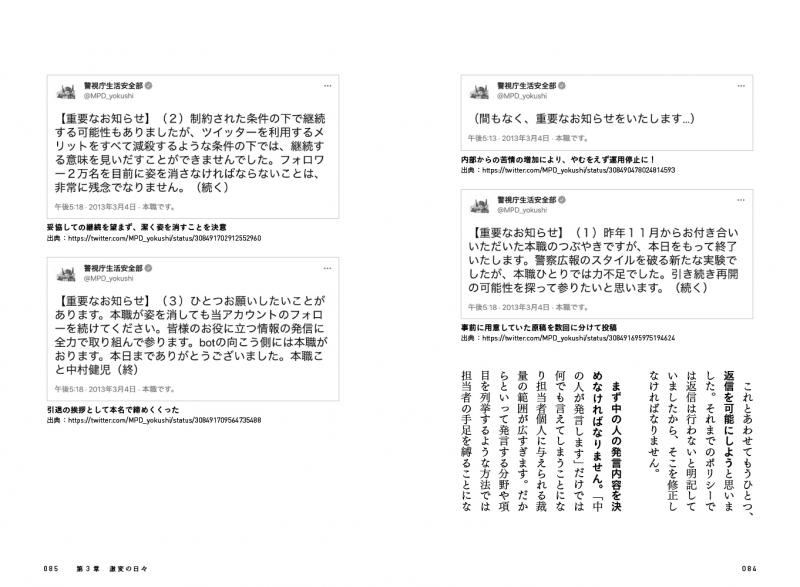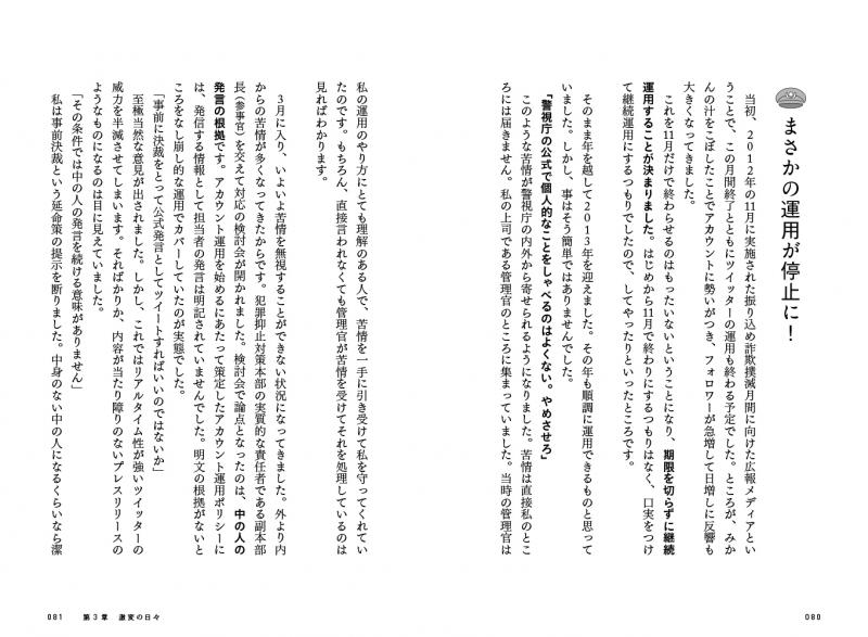 Twitterの運用を始めるまでには、警視総監の決裁が必要だった。運用ポリシーも定め、アカウントのIDも後に続く(であろう)警視庁アカウントに統一性を持たせるのを前提に決める。先駆者とは大変な苦労をしている。とはいえ愚痴混じりでも「中の人」、楽しそうだ。誤爆しても内側から足を引っ張られても負けない。企業公式Twitterは結果を求められがちだけど、これは固い土を耕す耕運機である。いつか豊作になる日のために地道に活動をするのである。身にしみるなぁ。