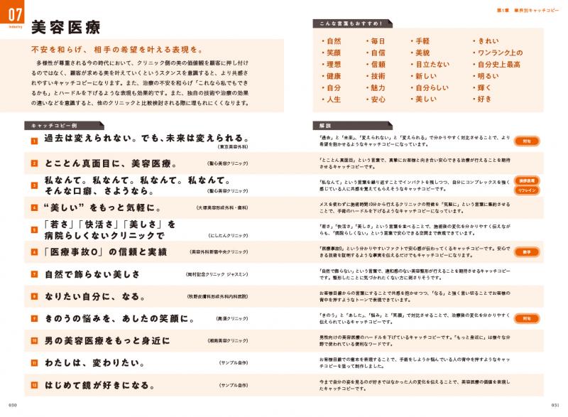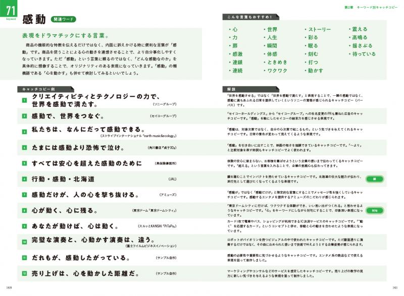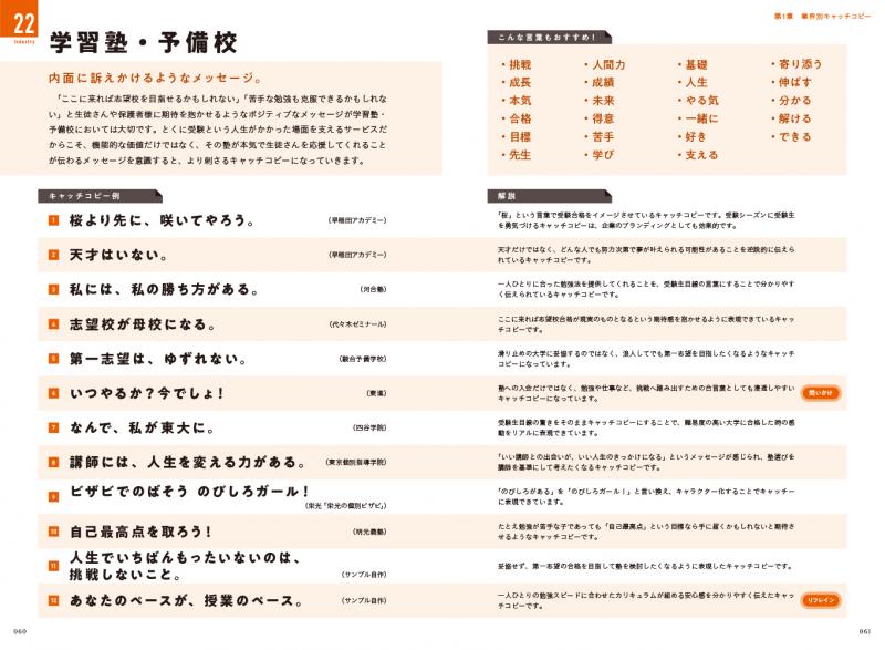 業界(食品、コスメ、IT、士業、教育等)、感情(おいしい、感動、安心、ワクワク等)、キーワード(春夏秋冬、笑顔、未来、健康等)、シーン(仲間、環境貢献のPR等)での名コピーや頻出コピー例と、アイデアヒントを厳選して紹介。制作の「たたき台」として使え、最終的な完成形のイメージをざっくりとつかんでおくのにも便利です。