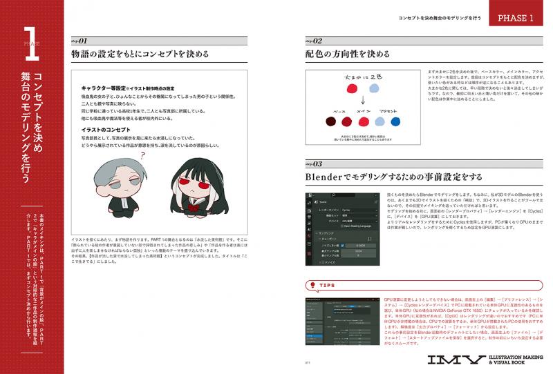 また、メイキングでは3D制作ソフトBlenderを使った背景空間の作り方を披露。キャラクターイラストにおいてどうやって3DCGを活用しているか、著者のメソッドを紹介しています。