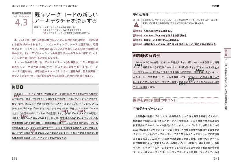 各例題で求められる要件やサービスの仕組みをわかりやすく理解できるよう、AWSの構成図(アーキテクチャ図)とその他の図版を多く収録しています。